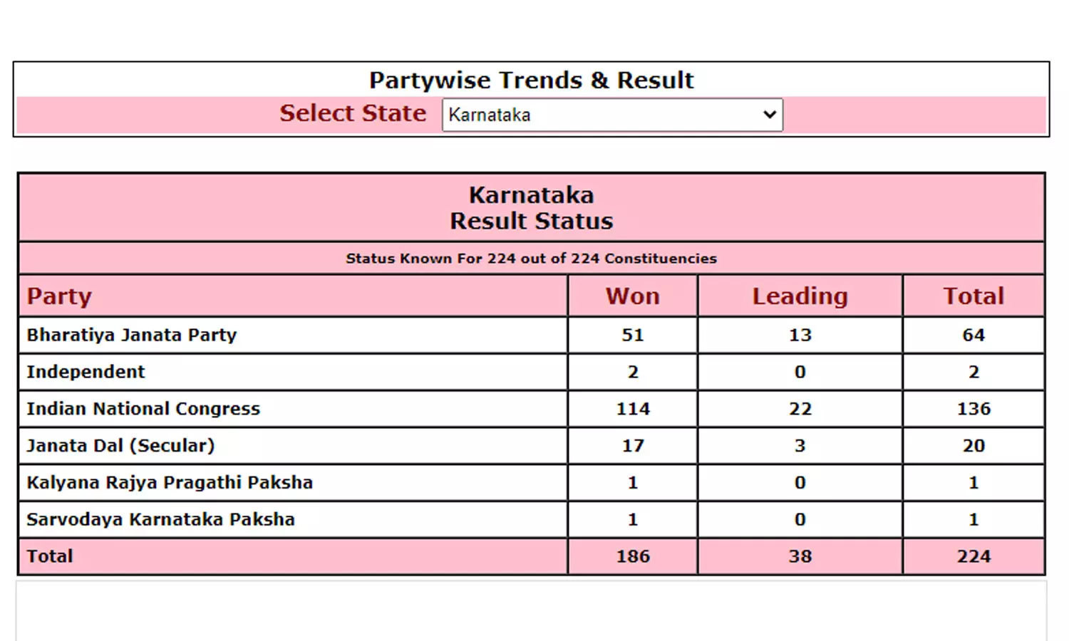 கர்நாடக சட்டமன்ற தேர்தலில் காங்கிரஸ் கட்சி 114 தொகுதிகளில் வெற்றி, மேலும் 22 இடங்களில் முன்னணியில் உள்ளது என்று தேர்தல் ஆணையம் அறிவிப்பு. கர்நாடகாவில் ஆட்சியமைக்க தேவையான இடங்களை விட கூடுதல் தொகுதிகளில் காங்கிரஸ் கட்சி வெற்றி பெற்றுள்ளது.