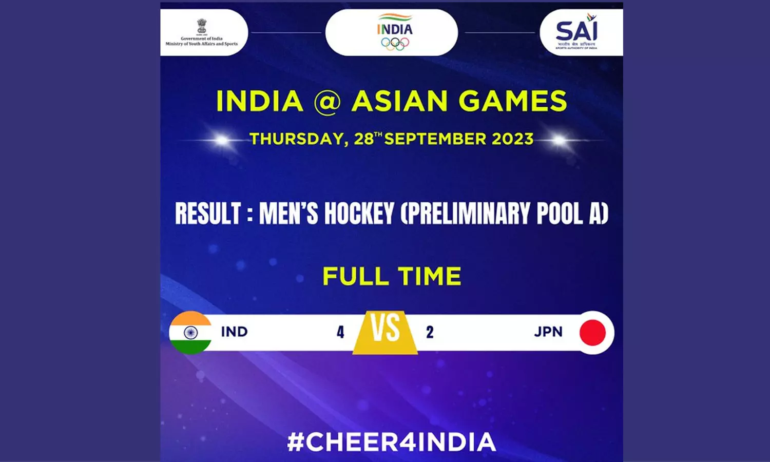 ஆண்கள் ஹாக்கி போட்டியில் நடப்பு சாம்பியன் ஜப்பானை 4-2 கோல் கணக்கில் இந்தியா வீழ்த்தியது. இந்தியா சார்பில் அபிஷேக் 2 கோல்களையும், அமித் ரோஹிதாஸ் மற்றும் மந்தீப் தலா ஒரு கோல் அடித்தனர்.