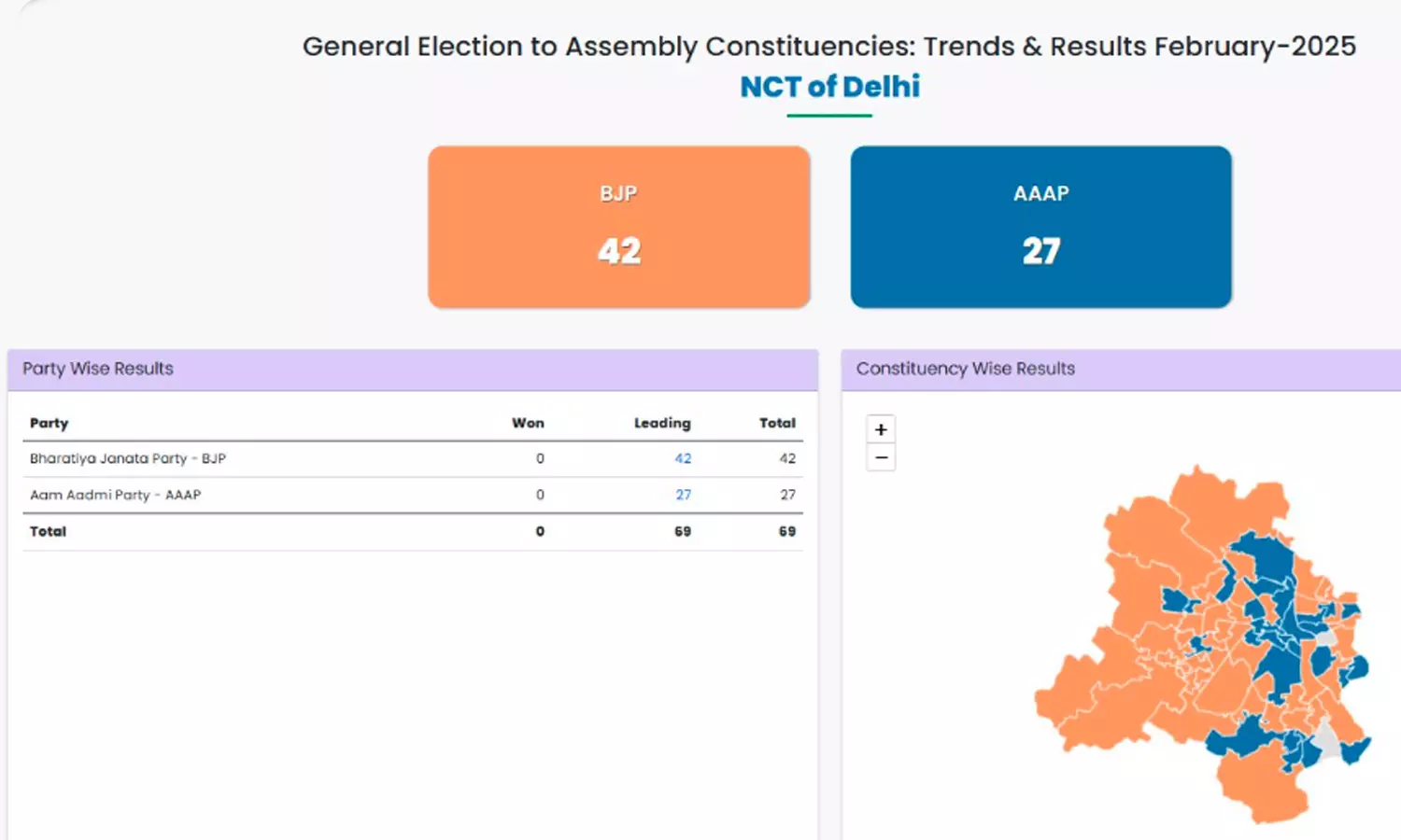 டெல்லி சட்டசபை தேர்தல் வாக்கு எண்ணிக்கையில் பா.ஜ.க. 42 இடங்களிலும், ஆம் ஆத்மி கட்சி 27 இடங்களிலும் முன்னிலை வகிக்கிறது.