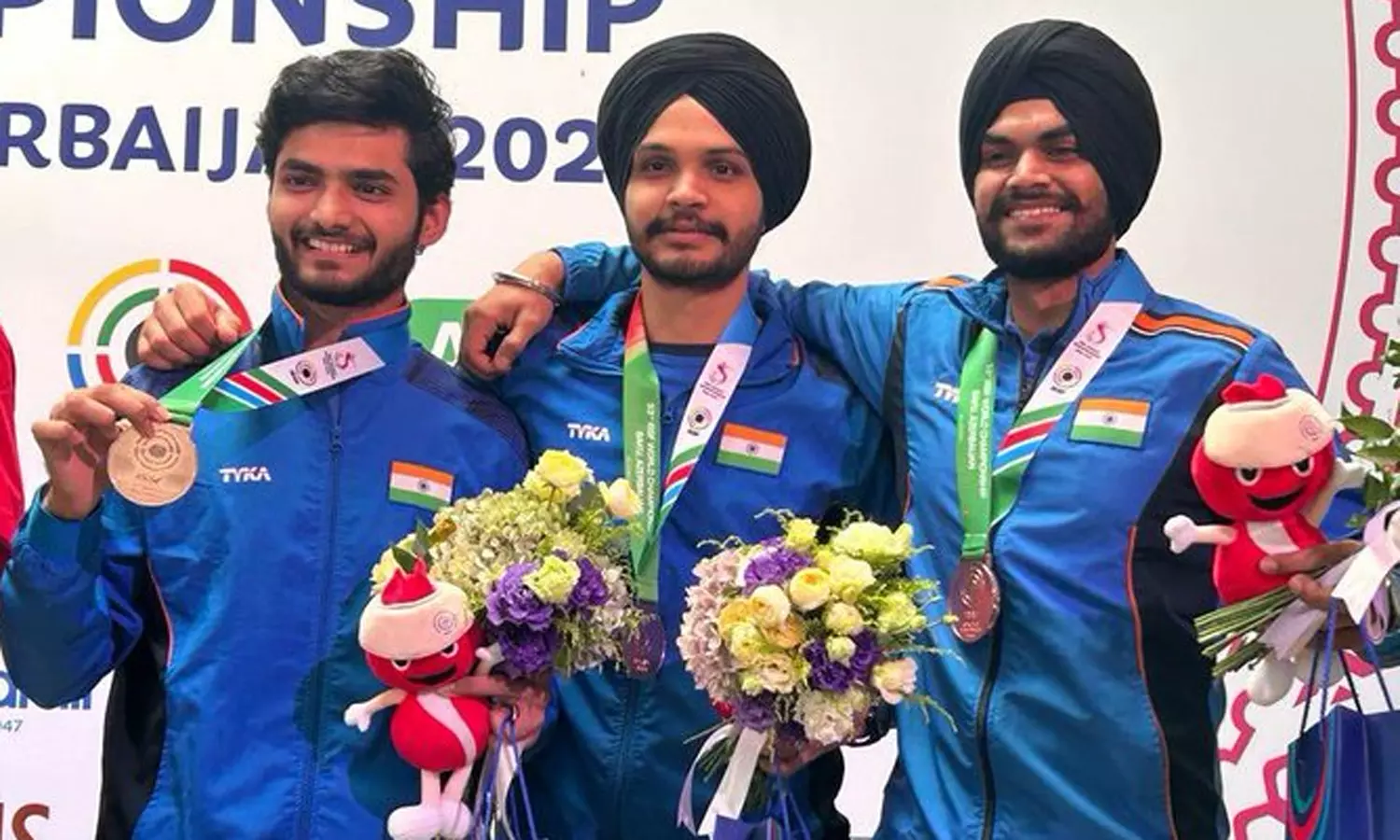 துப்பாக்கி சூடு 10 மீட்டர் ஏர் பிஸ்டல் ஆண்கள் அணி போட்டியில் 6 ரவுண்டுகள் சுற்று முடிவில் இந்தியா வீரர்களான அர்ஜூன் சீமா, சராப்ஜோட் சிங் மற்றும் ஷிவ நர்வா ஆகியோர் தங்கம் வென்றனர்.