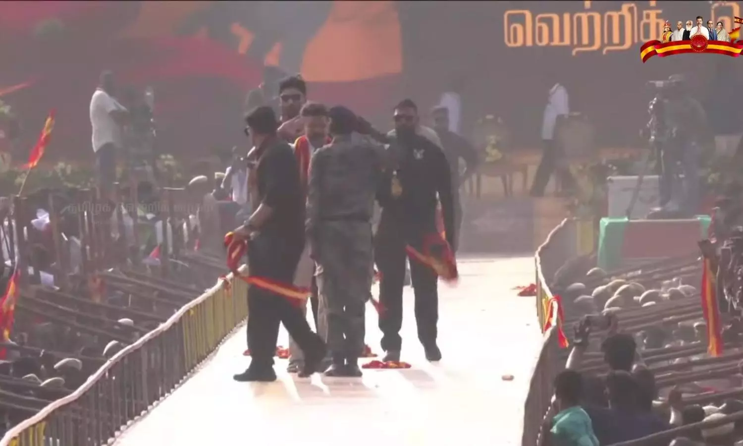 தமிழக வெற்றிக்கழக மாநாட்டின் Ramp-ல் நடந்து சென்றபோது தடுப்புக் கட்டை மீது ஏறி வந்து சல்யூட் அடித்த பாதுகாவலருக்கு விஜய் வணக்கம் வைத்தார்.