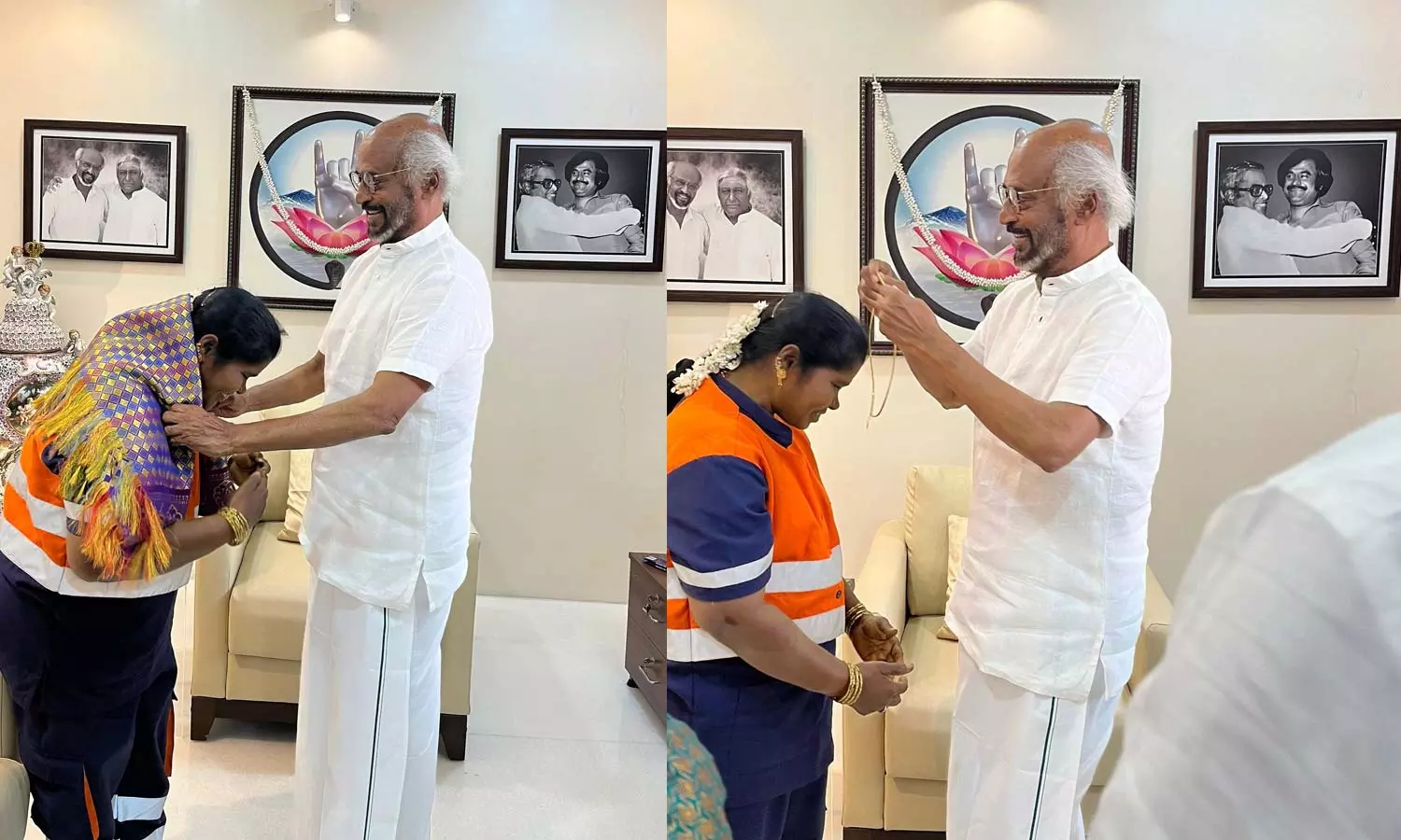 தூய்மைப் பணியாளர் பத்மாவை வீட்டிற்கு அழைத்து தங்க செயின் பரிசளித்த ரஜினி