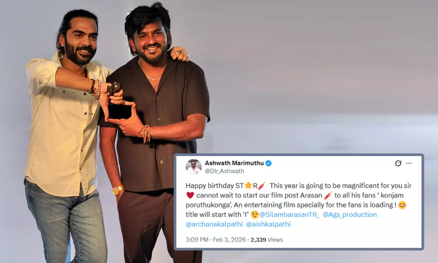 இது குறித்த X தள பதிவில், "பிறந்த நாள் வாழ்த்துக்கள் எஸ்.டி.ஆர். இந்த ஆண்டு உங்களுக்கு சிறப்பானதாக இருக்கப் போகிறது. அரசன் படத்தைத் தொடர்ந்து நமது படத்தை தொடங்க காத்திருக்க முடியவில்லை. அவரது ரசிகர்கள் அனைவருக்கும், "கொஞ்சம் பொறுத்துக்கங்க" ரசிகர்களுக்காக பொழுதுபோக்கு அம்சங்கள் நிறைந்த படம் தயாராகிறது. படத்தின் தலைப்பு "I" என்ற வார்த்தையில் தொடங்குகிறது," என குறிப்பிட்டுள்ளார்.