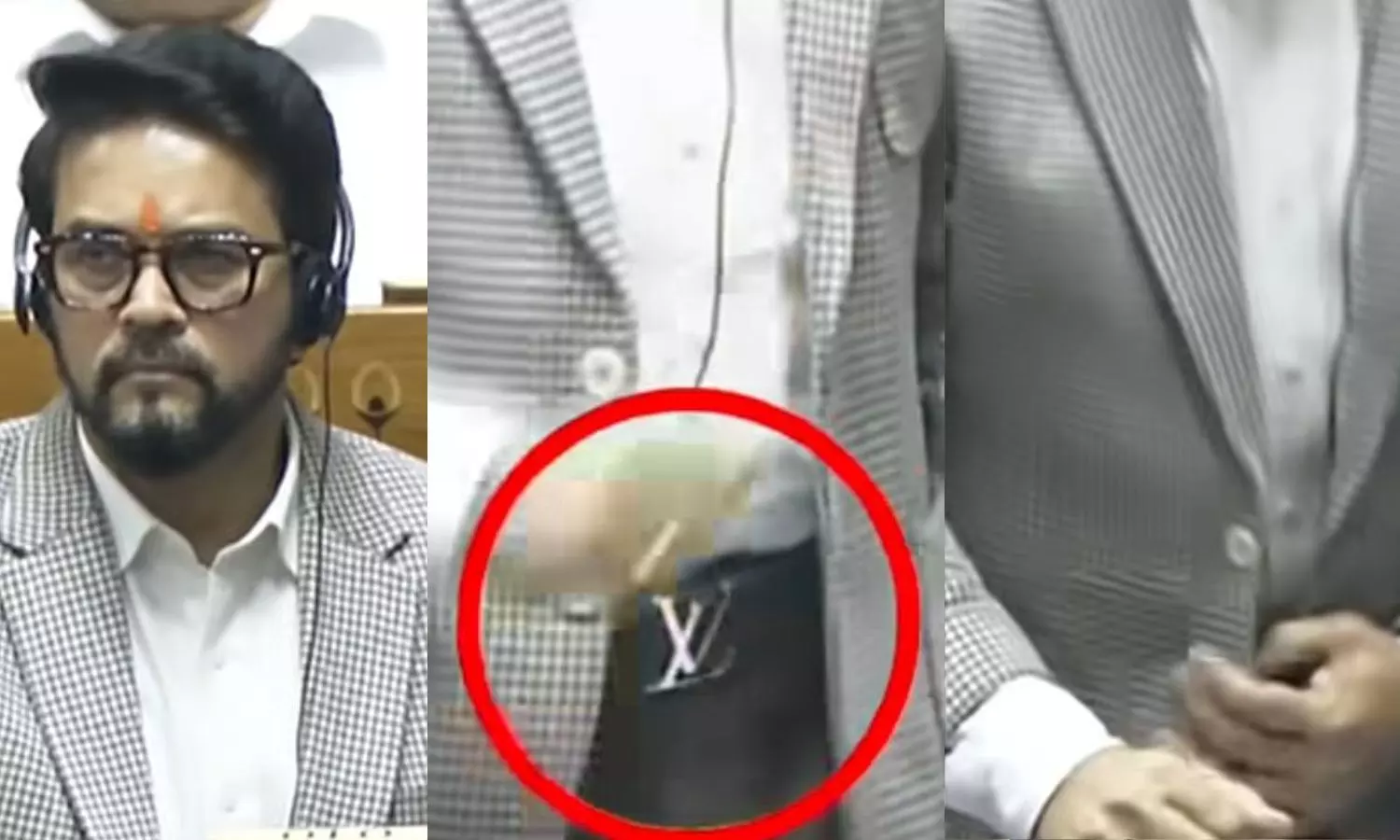 நேற்று, நாடாளுமன்றத்தில் அமளிக்கு இடையே அனுராக் தாகூர் பேச எழுந்தபோது, அவர் அணிந்திருந்த விலையுயர்ந்த Louis Vuitton பிராண்ட் பெல்ட் வெளியே தெரிந்தது.