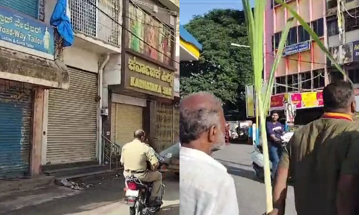மாண்டியா நகரில் கடைகள் அடைக்கப்பட்டுள்ள காட்சி - மாண்டியாவில் கரும்புடன் போராட்டம் நடத்திய விவசாயிகள்