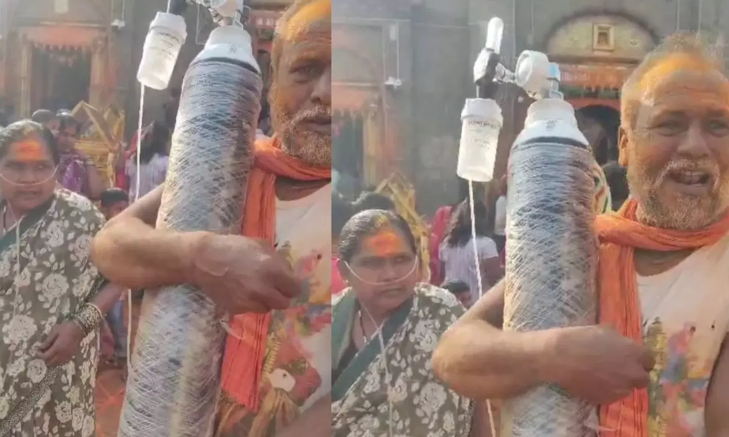 ஆக்சிஜன் சிலிண்டரை சுமந்தபடி மனைவியை கோவிலுக்கு அழைத்து சென்ற விவசாயி- பக்தர்களை நெகிழ வைத்த தம்பதி