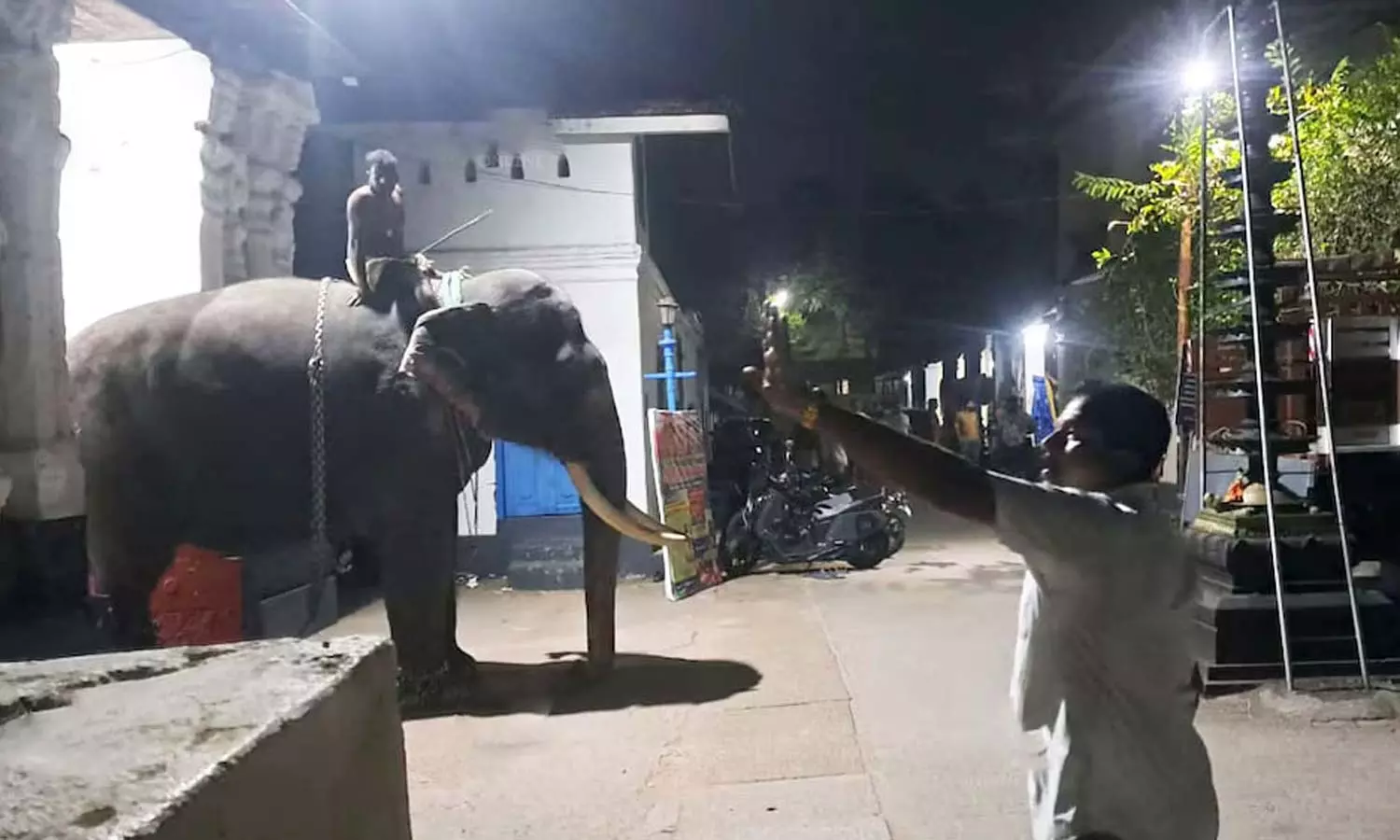 கோவிலில் ஆக்ரோஷமாக ஓடி பரபரப்பை ஏற்படுத்திய யானை கட்டுக்குள் கொண்டுவரப்பட்ட காட்சி.