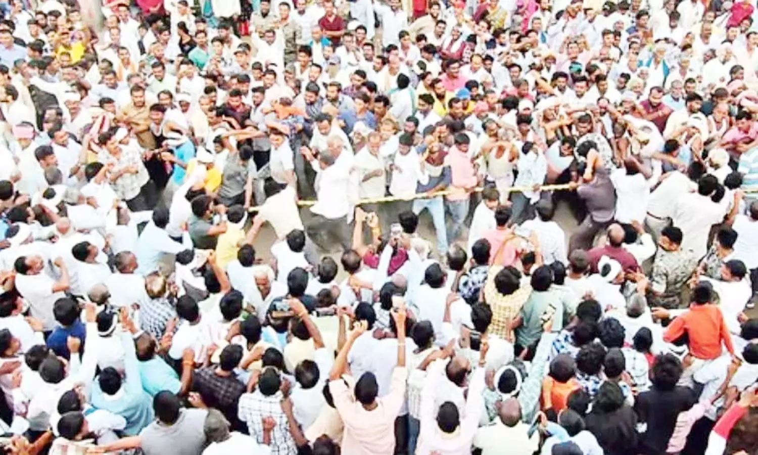 நேற்று மாலை கிராமத்தில் உள்ள ஹனுமான் கோவிலை அடைந்த கிராம மக்கள் சாலையின் நடுவில் ஒரு கயிற்றைக் கட்டி இருபுறமும் இரண்டு குழுக்களாகப் பிரிந்தனர்.