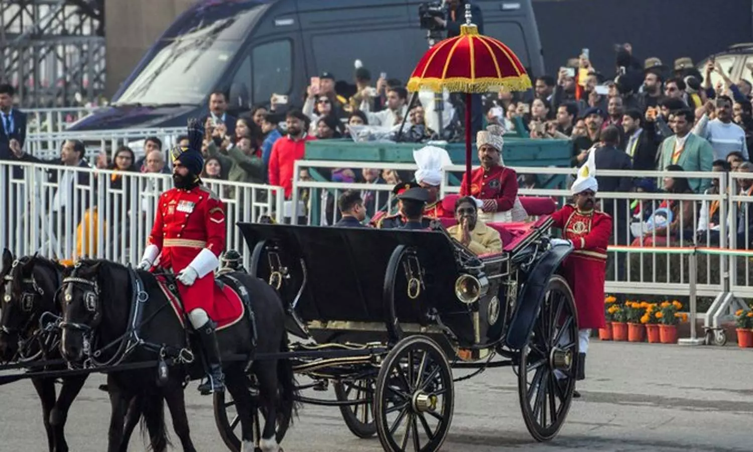 - இந்த விழாவுக்கு குதிரைப்படை சூழ ஜனாதிபதி திரவுபதி முர்மு அழைத்து வரப்பட்டார்.