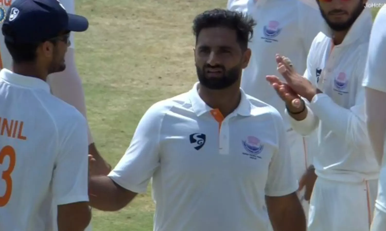 - ஜம்மு காஷ்மீர் தரப்பில் நபி தார் 5 விக்கெட்டுகளை கைப்பற்றினார்.