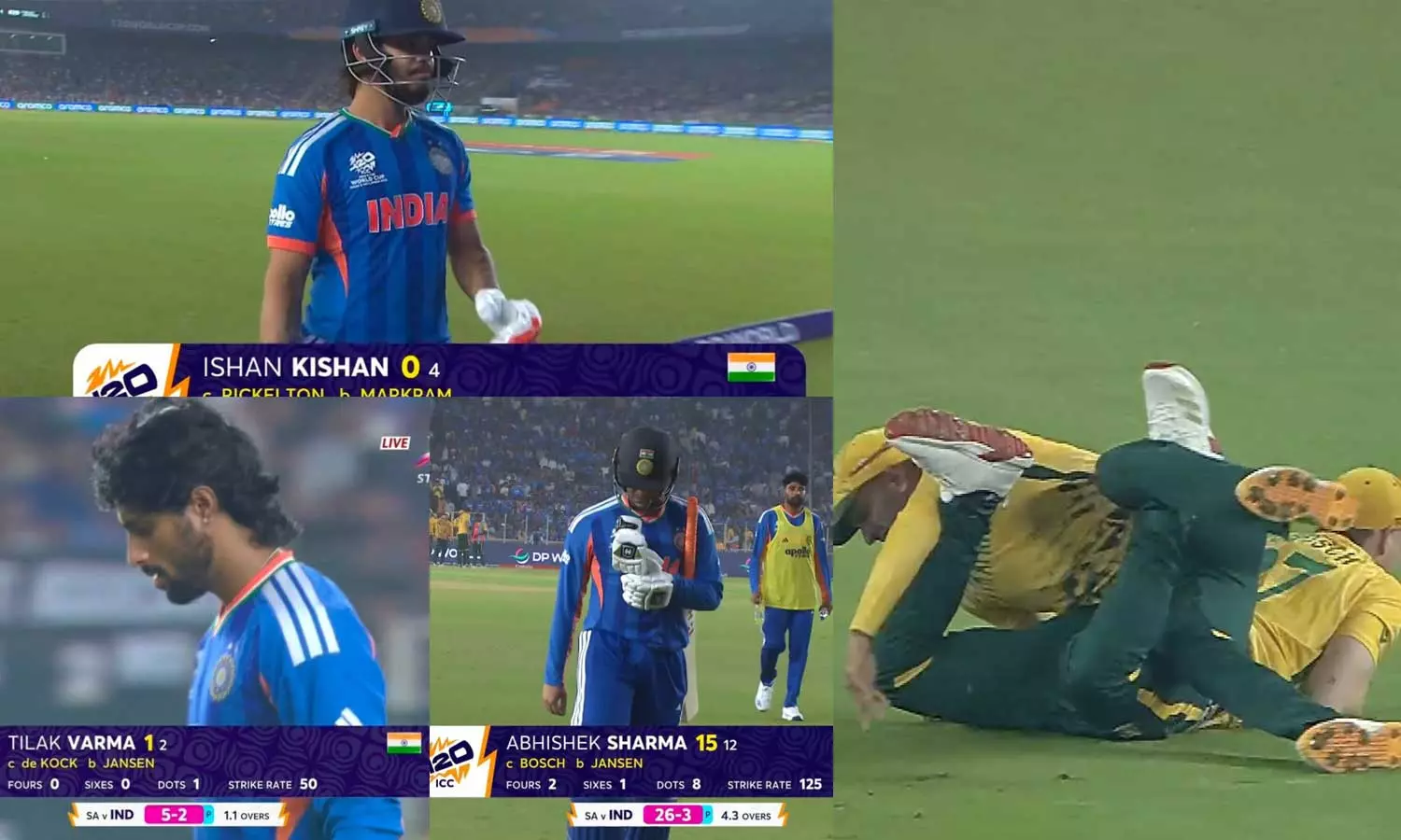 இதையடுத்து 188 ரன்கள் என்ற இலக்குடன் களமிறங்கிய இந்தியா 26 ரன்களுக்கு 3 விக்கெட்டுகளை இழந்து தடுமாறியது. இஷான் கிஷன் டக் அவுட்டாக திலக் வர்மா 1 ரன்னில் அவுட்டாகி வெளியேறினார். தொடர்ந்து 3 போட்டிகளில் டக் அவுட்டான அபிஷேக் சர்மா இந்த போட்டியில் 15 ரன்கள் அடித்து அவுட்டானார்.