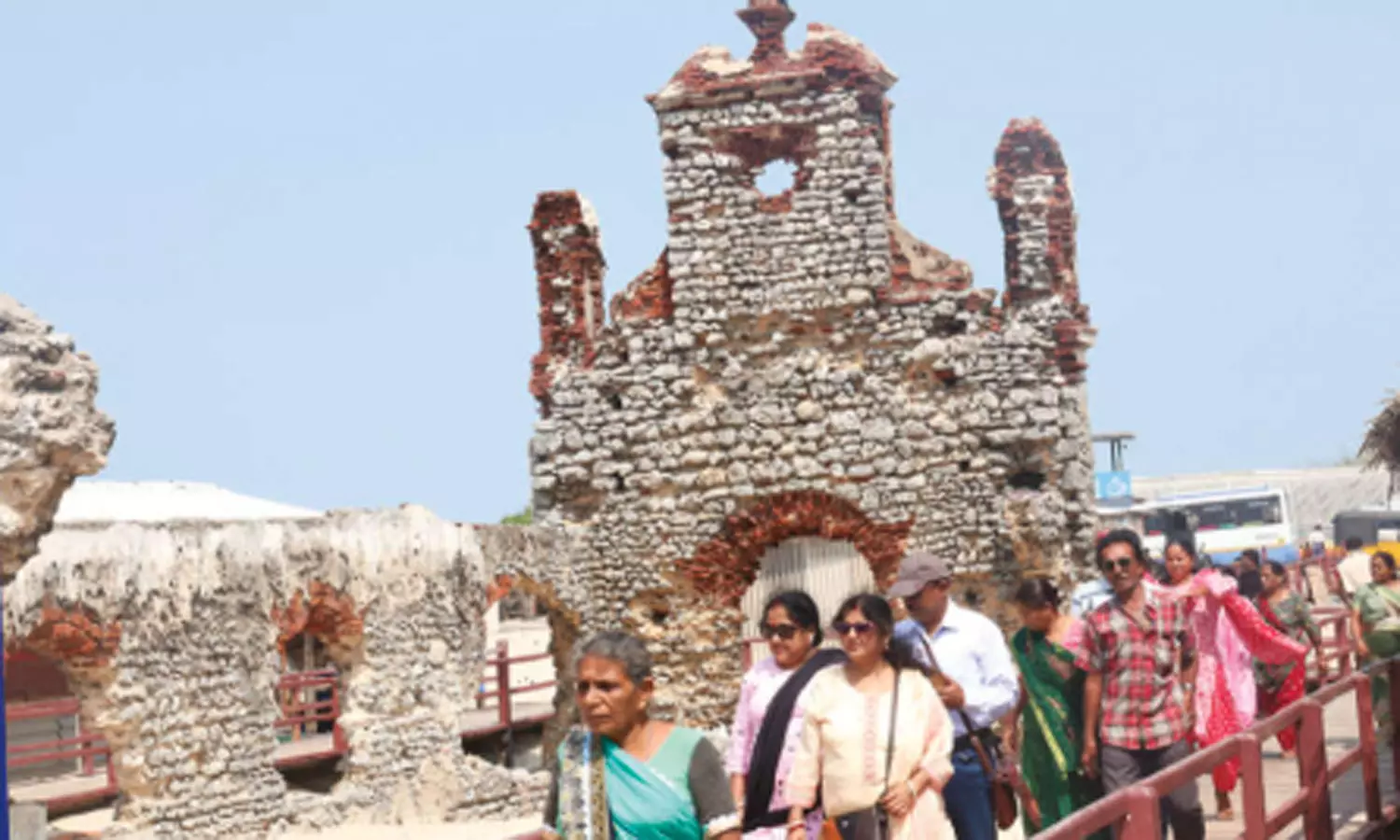 புயலால் சேதமடைந்த கிறிஸ்தவ ஆலயத்தை பார்வையிட்ட சுற்றுலா பயணிகள்