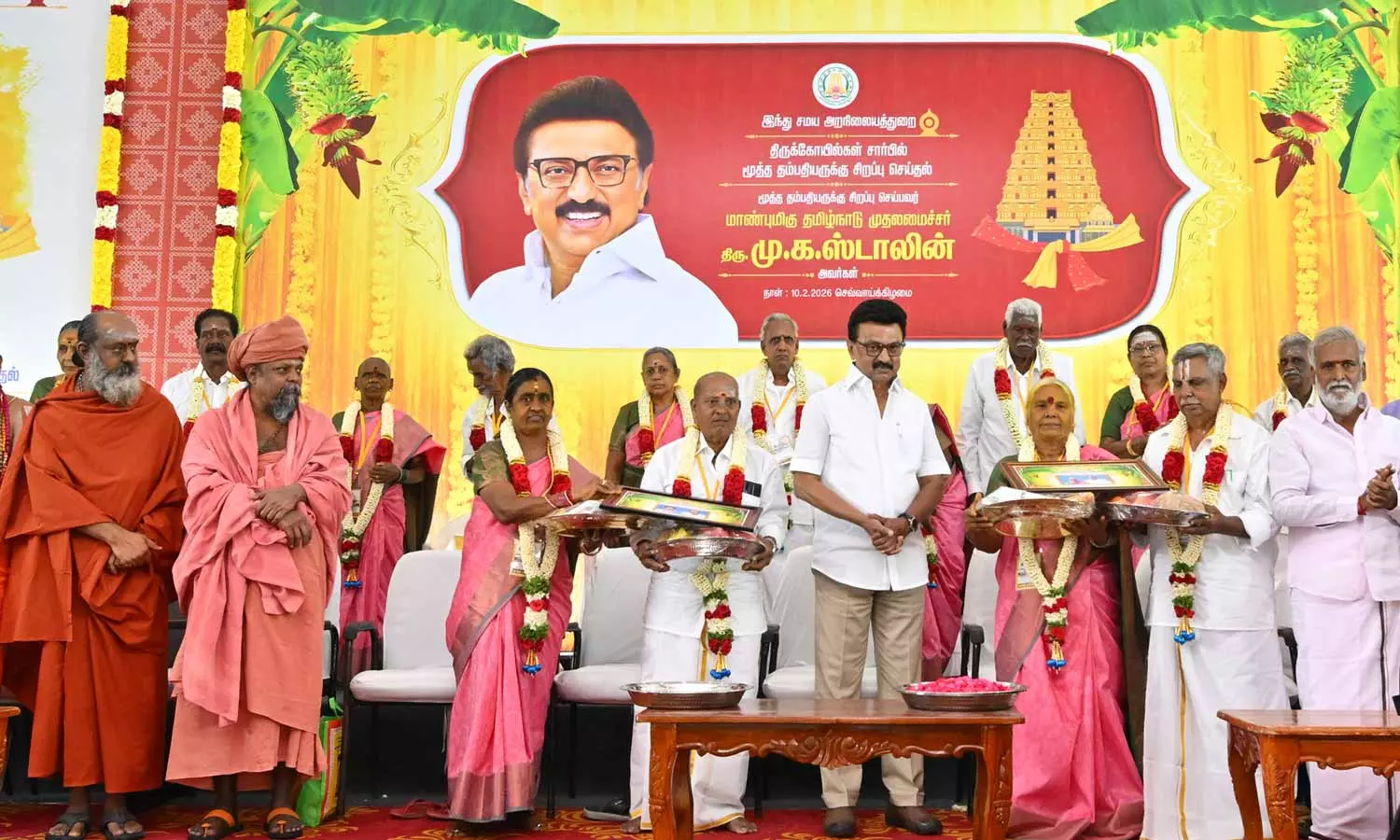அதனைத் தொடர்ந்து, இரண்டாம் கட்டமாக கோவில்கள் சார்பில் 20,000 மூத்த தம்பதியினருக்கு சிறப்பு செய்திடும் வகையில் சென்னை வேப்பேரி பி.கே.என் ஆடிட்டோரியத்தில் நடைபெற்ற விழாவில், முதலமைச்சர் மு.க.ஸ்டாலின் இன்றையதினம் 70 வயது பூர்த்தியடைந்த 500 மூத்த தம்பதியினருக்கு வேட்டி மற்றும் சட்டை, புடவை, ரவிக்கை, பழ வகைகள், மஞ்சள், குங்குமம், கண்ணாடி வளையல்கள், குங்குமசிமிழ் உள்ளிட்ட மங்கலப் பொருட்களை வழங்கி சிறப்பு செய்து தொடங்கி வைத்தார்.