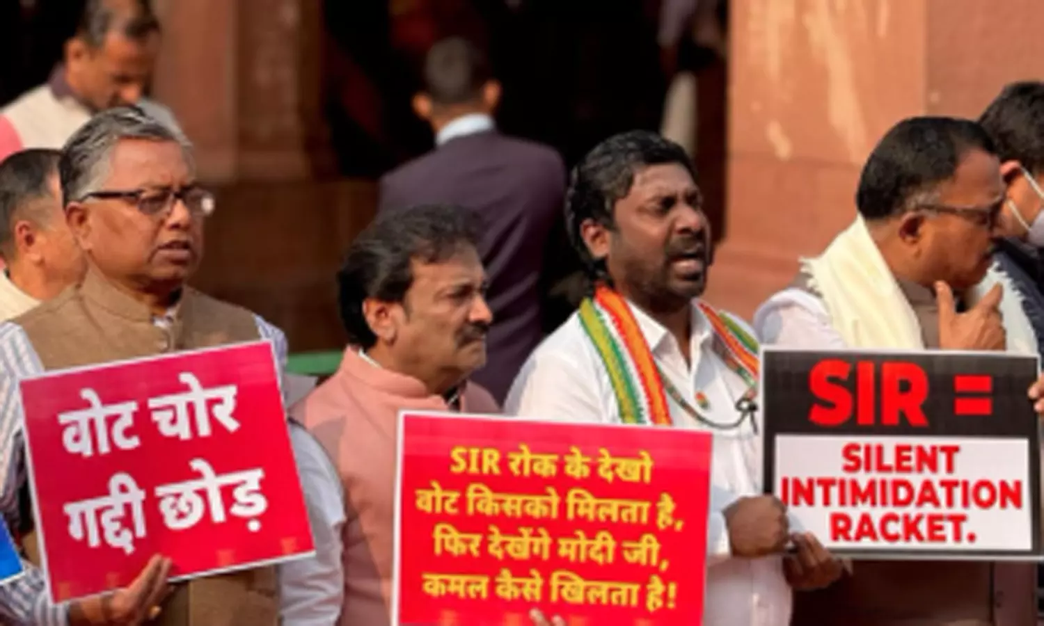 ஆர்ப்பாட்டத்தில் காங்கிரஸ் தலைவர் மல்லிகார்ஜுன கார்கே, முன்னாள் கட்சித் தலைவர் சோனியா காந்தி, மக்களவை எதிர்க்கட்சி தலைவர் ராகுல் காந்தி உட்பட பல எதிர்க்கட்சித் தலைவர்கள் பங்கேற்று SIR-க்கு எதிராகவும், தேர்தல் சீர்திருத்தங்கள் குறித்து விவாதிக்கக் கோரியும் ஆர்ப்பாட்டம் நடத்தினர்.