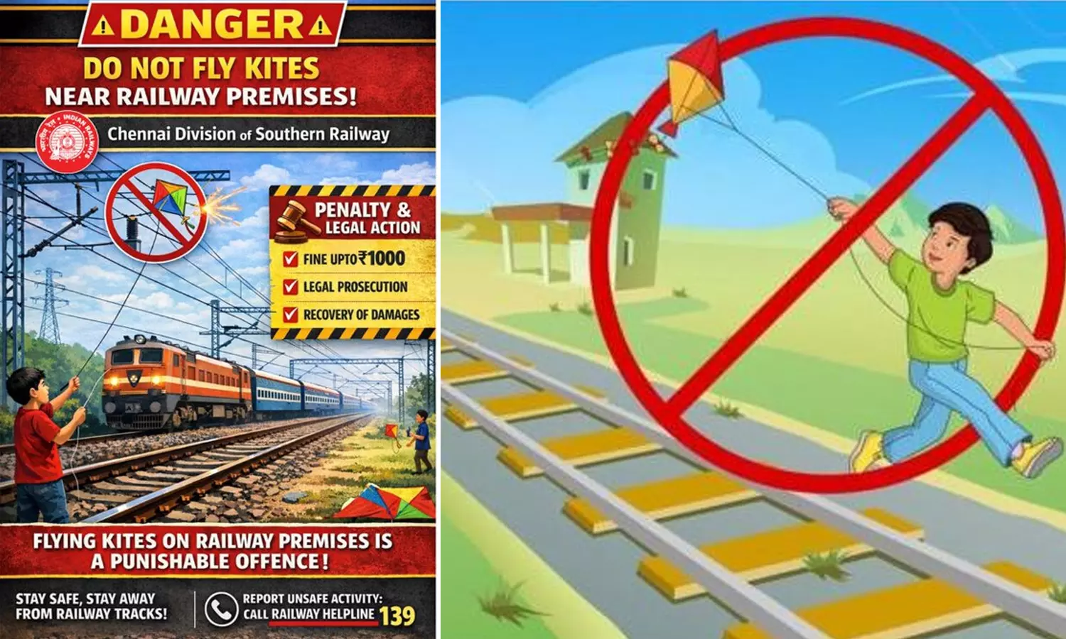 தண்டவாளம் அருகே பட்டம் விடுபவர்களுக்கு 6 மாதம் சிறை அல்லது ரூ.1000 விதிக்கப்படும்" என எச்சரிக்கை விடுத்துள்ளது.