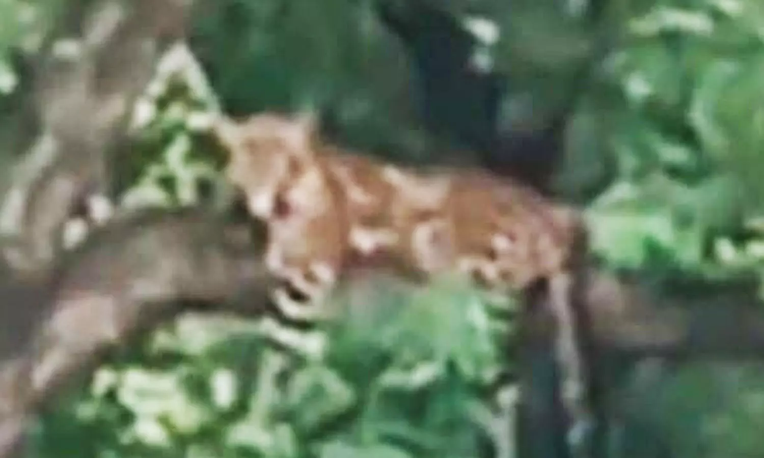 அந்த வழியாக சென்ற வாகன ஓட்டிகள் தங்களது செல்போனில் இதை வீடியோவாக பதிவு செய்தனர். கிட்டத்தட்ட ஒரு மணி நேரத்துக்கு பிறகு மரத்தில் இருந்த சிறுத்தை கீழே இறங்கி மீண்டும் வனப்பகுதிக்குள் சென்றது.
