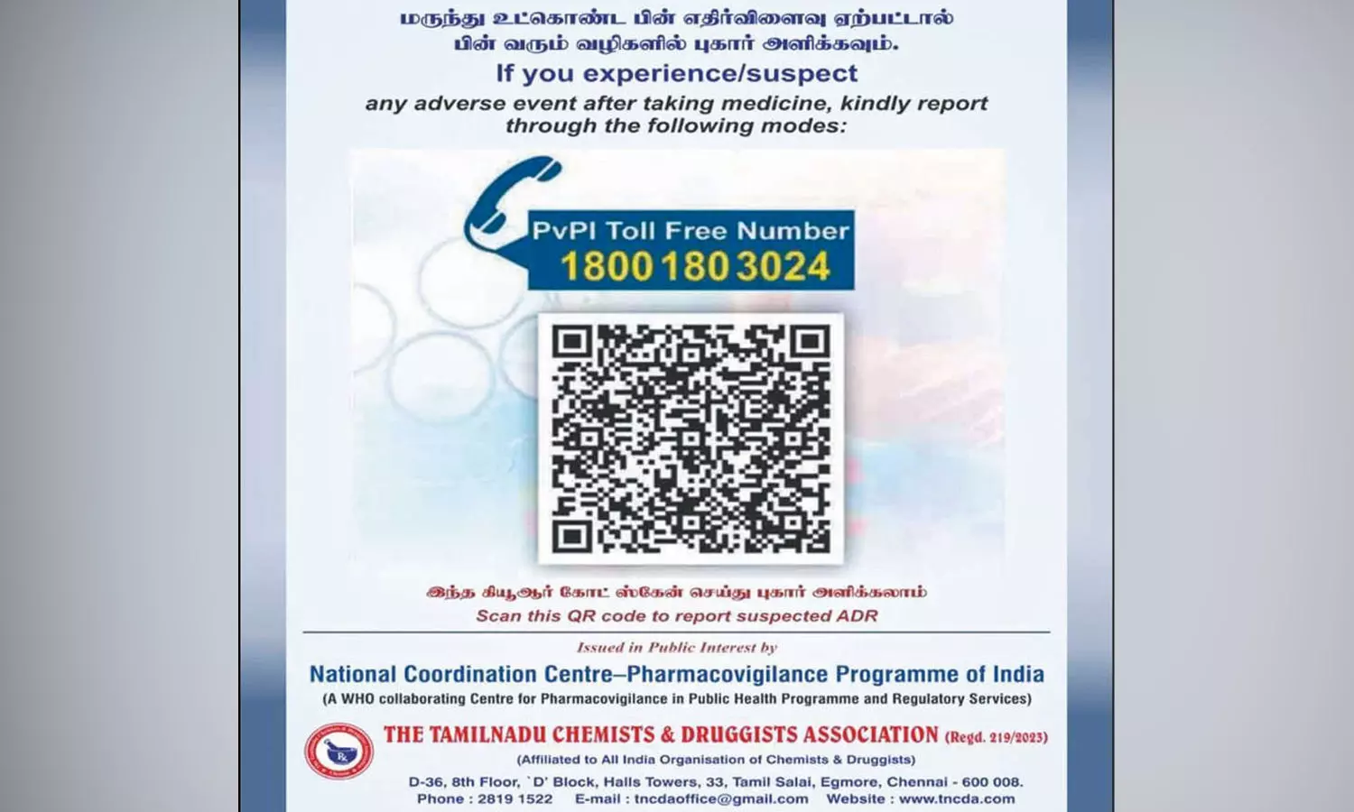 அவற்றை அனைத்து மருந்தகங்களின் முகப்பிலும், பொதுமக்கள் எளிதில் தெரியும் வகையில் காட்சிப்படுத்த மருந்து கட்டுப்பாட்டு வாரியம் அறிவுறுத்தி உள்ளது. இனி, மருந்துகளால் ஏற்படும் பக்கவிளைவுகள் மற்றும் பாதிப்பு குறித்து குறிப்பிட்ட 'கியூ ஆர்' குறியீடு வாயிலாக பொதுமக்கள் புகார் அளிக்கலாம்.