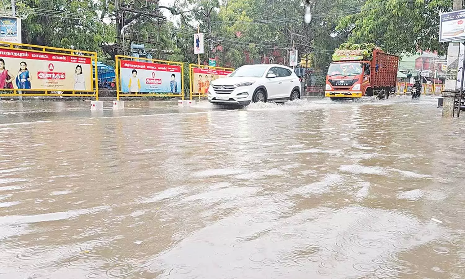 ராமநாதபுரத்தில் பெய்த கனமழையால் சாலையில் குளம்போல் தேங்கியிருக்கும் மழைநீர்