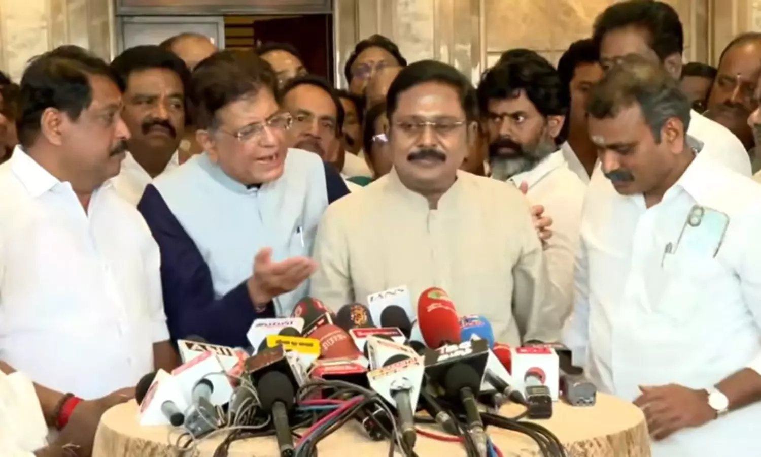 - பியூஸ் கோயல், டிடிவி தினகரன் ஆகியோர் கூட்டாக செய்தியாளர்களை சந்தித்தனர்.