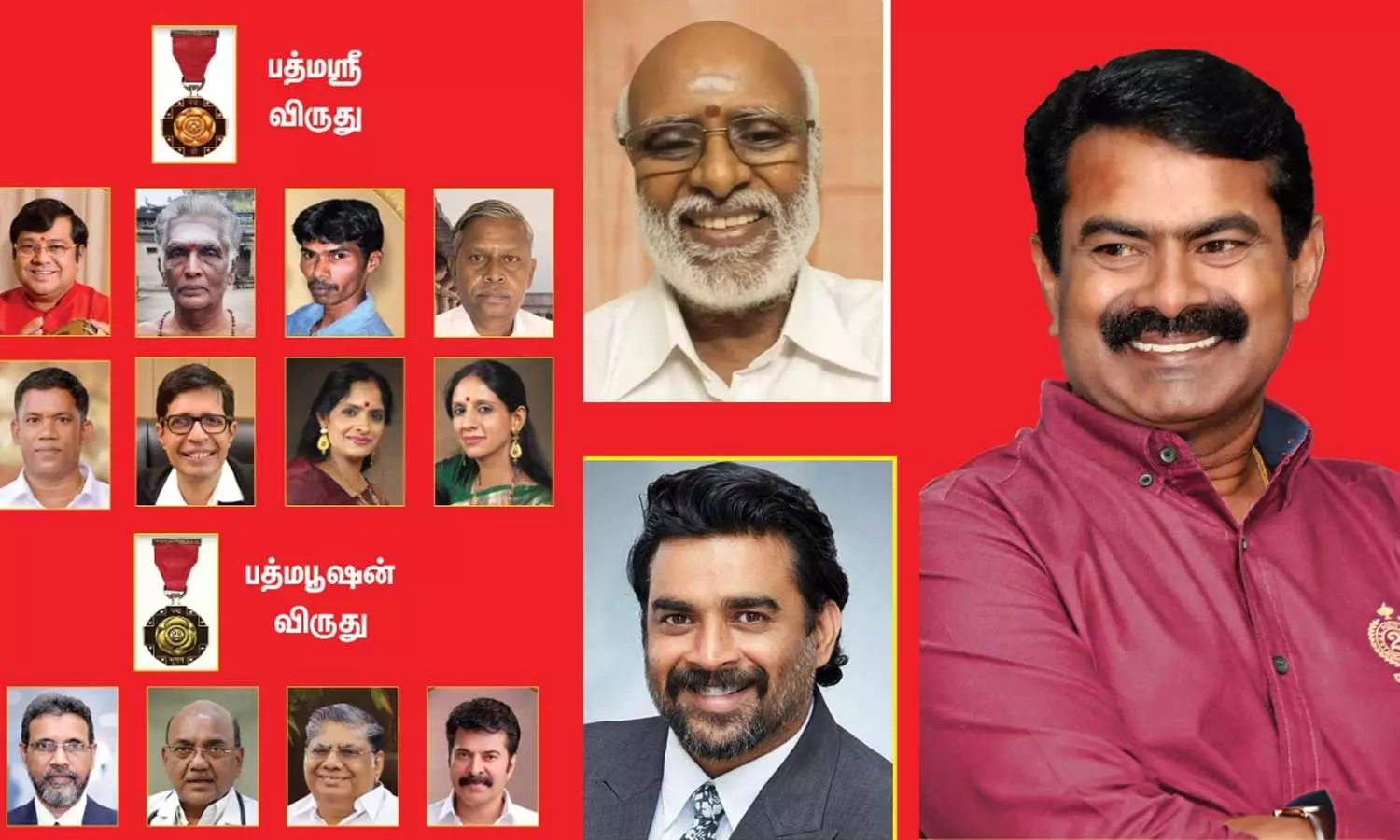 இந்நிலையில் தமிழகத்தைச் சேர்ந்த பத்ம விருதாளர்களுக்கு நாம் தமிழர் ஒருங்குணைப்பாளர் சீமான் வாழ்த்து தெரிவித்துள்ளார்.