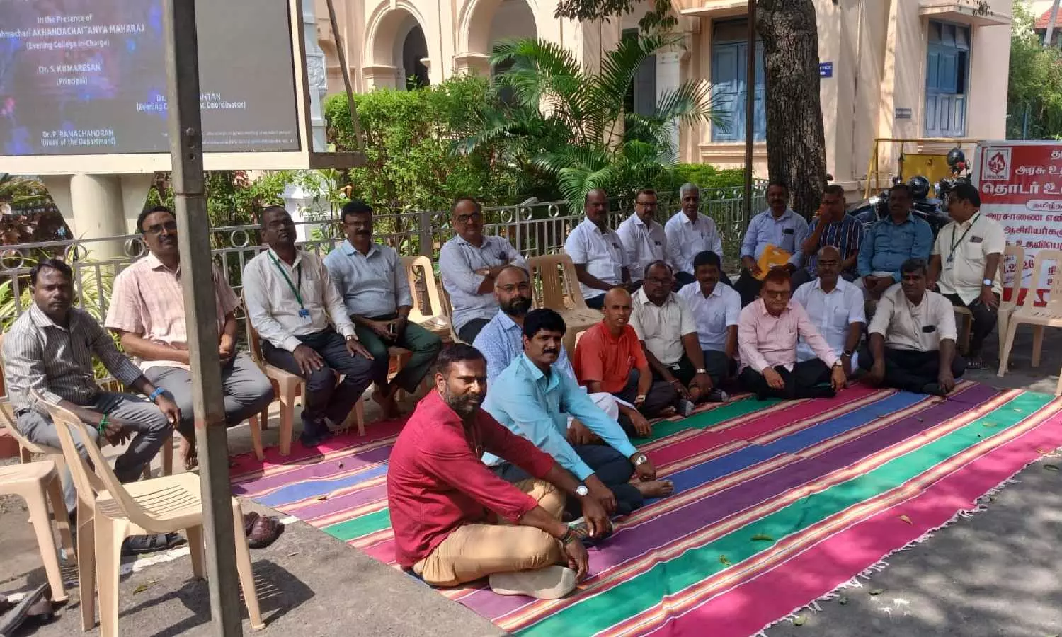 சென்னையில் புதுகல்லூரி, மயிலாப்பூரில் உள்ள விவேகானந்தா கல்லூரிகளில் உள்ள ஆசிரியர்கள் கல்லூரி வளாகங்களுக்கு உள்ளேயே போராட்டத்தை கையிலெடுத்துள்ளனர். தமிழ்நாட்டில் அரசு உதவிபெறும் கல்லூரிகளில் பணியாற்றும் ஆசிரியர்களுக்கு கடந்த 2021ஆம் ஆண்டு பணி மேம்பாடு ஆணை வழங்கப்பட்டது. ஆனால் இன்னும் ஊதியம், நிலுவைத்தொகை வழங்கப்படாமல் நிறுத்தி வைக்கப்பட்டுள்ளது.