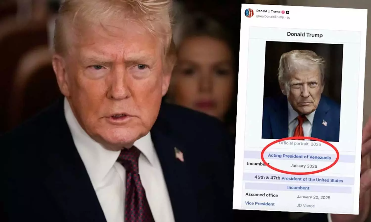 அமெரிக்க அதிபர் டிரம்ப் தனது சமூக வலைதள பதிவில், வெனிசுலாவின் பொறுப்பு அதிபர் டிரம்ப் என்று குறிப்பிட்டுள்ள விக்கிபீடியா பக்கத்தை பகிர்ந்துள்ளார்.