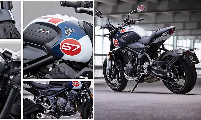 டிரைடன்ட் டிரிபில் டிரிபியூட் மாடல் டிஸ்டின்டிவ் வைட் மற்றும் மெட்டாலிக் புளூ, ஆங்காங்கே ரெட் ஸ்டிரீக் ஃபினிஷ் கொண்டிருக்கிறது. இத்துடன் 67 எண்ணின் கிராஃபிக் இடம்பெற்று இருக்கிறது. மேலும் இந்த நிறத்திற்கு ஒற்றுப்போகும் நிறத்தில் ஃபிளை ஸ்கிரீன் மற்றும் பெல்லிபேன் வழங்கப்பட்டு இருக்கிறது. இவை இந்த மாடலை ஸ்டான்டர்டு எடிஷனில் இருந்து வித்தியாசமானதாக மாற்றுகிறது.