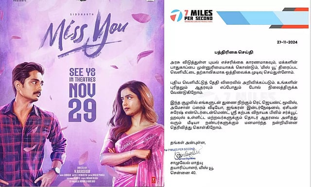மேலும் 'மிஸ் யூ' படத்தின் புதிய வெளியீட்டுத் தேதி விரைவில் அறிவிக்கப்படும் என்று படக்குழு அறிவித்துள்ளது.