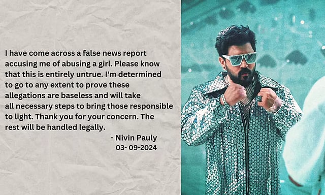 இதனை தற்பொழுது மறுத்து நிவின் பாலி மறுத்து அவரது எக்ஸ் தளத்தில் பதிவு ஒன்றை பதிவிட்டுள்ளார். அதில் " நான் என் மீது சுமத்தப்பட்ட பாலியல் குற்றச்சாட்டை கேள்விப் பட்டேன். இது முற்றிலும் பொய்யானது. நான் என் மீது உள்ள நியாயத்தை நிரூபிக்க எந்த எல்லைக்கும் செல்வேன். உண்மையான குற்றவாளியை வெளிச்சத்திற்கு கொண்டு வருவேன். மத்ததெல்லாம் சட்ட ரீதியாக கையாளப்படும்" என தெரிவித்துள்ளார்.