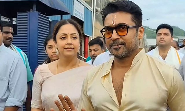 இந்நிலையில் அகரம் தொண்டு நிறுவனத்தின் 15வது ஆண்டு விழா முடிந்த கையோடு, திருப்பதி ஏழுமலையான் கோவிலில் சூர்யா - ஜோதிகா தம்பதி சாமி தரிசனம் செய்துள்ளனர்.