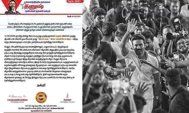 அதில் "பேரன்புக்கும் மரியாதைக்கும் உரிய தலைவர் தனுஷ் நண்பர்கள் நற்பணி மன்ற மாவட்ட நிர்வாகிகள், பொறுப்பாளர்கள், உறுப்பினர்கள், தாய்மார்கள், குழந்தைகள், ரசிகர்கள் மற்றும் தமிழக மக்கள் அனைவருக்கும் வணக்கம்!