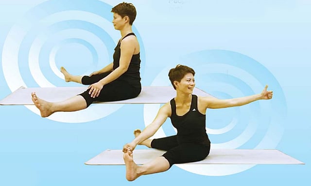 விரிப்பில் மீது அமர்ந்து 2 கால்களையும் நன்றாக விரித்து அமர வேண்டும். மூச்சை உள்ளிழுக்கும்போது 2 கைகளையும் மேலே உயர்த்திய நிலையில் வைக்க வேண்டும். வலதுகையால் இடதுகால் கட்டை விரலையும், இடதுகையால் வலதுகால் கட்டை விரலையும் மாறி மாறி தொட வேண்டும். வலதுகையால், இடதுகால் கட்டை விரலைத் தொடும்போது, இடது கையை நன்றாக நீட்டிய நிலையில் வைக்க வேண்டும்.
