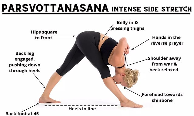 பின் மெதுவாக நிமிர்ந்து கால்களை மாற்றி செய்யவும். அதாவது வலது காலுக்கு பதிலாக இடது காலை முன்னோக்கி நகர்த்தி வைத்து இரண்டு கைகளையும் முதுகிற்கு பின்னால் கொண்டு சென்று முழங்கைகளை கட்டிக்கொண்டோ அல்லது இரு உள்ளங்கைகளையும் குவித்து கும்பிடுவது போல வைத்துககொண்டோ முன்போல மெதுவாக இடுப்பை முன்னோக்கி வளைத்து இடது முழங்காலில் உங்கள் முகம் படும்படி 30 விநாடிகள் இருக்கவும். இவ்வாறு இரு கால்களையும் மாற்றி மாற்றி 3 முதல் 5 முறை செய்யவும்.