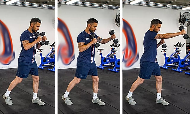 இரண்டு கால்களையும் தோள்களிலிருந்து சற்றே விலக்கி நிற்க வேண்டும். சற்றே இடுப்பை வளைத்து இரண்டு கைகளிலும் டம்பிள்ஸை வைத்துக் கொள்ளவும். இடதுகாலை மட்டும் சற்றே முன்னெடுத்து வைத்து, பின்காலை பின்னோக்கி வைத்துக் கொள்ளவும். உடல் நேராக இருக்க வேண்டும். இரண்டு கைகளையும் மடக்கி, முகத்தின் இரண்டு பக்கத்திற்கு நேராக கொண்டு வரவும்.