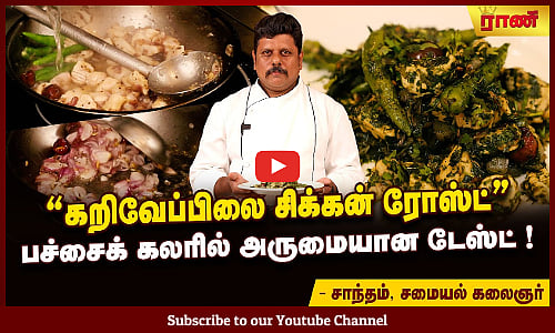 சிக்கன் பிரியர்களுக்காகவே தனித்துவமான சுவையுடன், ஆரோக்கியம் நிறைந்த ஓர் உணவுதான் ''கறிவேப்பிலை சிக்கன் ரோஸ்ட்''. கலப்படமற்ற, இயற்கையான சுவையுடன் கூடிய உணவுகளை விரும்புபவர்களுக்கு இது ஒரு சிறந்த தேர்வு. வழக்கமான சிக்கன் உணவுகளில் இருந்து முற்றிலும் மாறுபட்டு, இதன் தனித்துவமான மணமும், கறிவேப்பிலையின் ஆரோக்கியமும் இணைந்து ஒரு புதுமையான சுவையை வழங்குகிறது. ஆரோக்கியத்தையும், சுவையையும் விரும்பும் அசைவப் பிரியர்களுக்கென்றே பிரத்யேகமான இந்த உணவை, செயற்கை நிறமூட்டிகள் இல்லாமல், முற்றிலும் இயற்கையான முறையில் ஃபெரோஸ் ஹோட்டலின் செஃப் சாந்தம் செய்து காட்டுகிறார்.