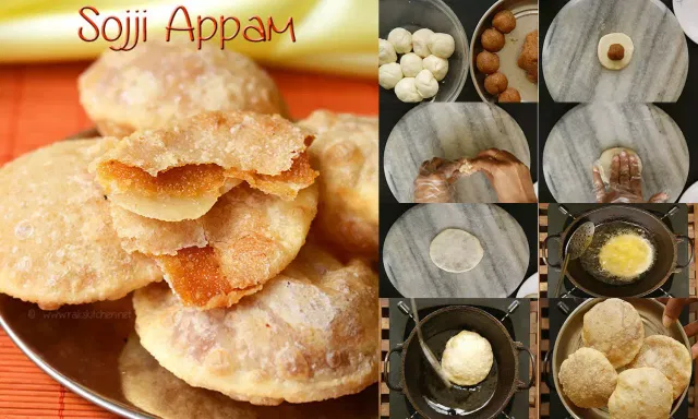 வாணலியில் எண்ணெய் சூடானதும் திரட்டிவைத்துள்ள சொஜ்ஜி அப்பத்தை போட்டு பொரித்தெடுத்துப் பரிமாறுங்கள்.