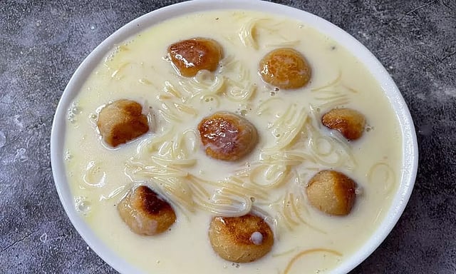 அதே கடாயில் மீண்டும் சிறிதளவும் நெய் சேர்த்து அதில் சேமியாவை நிறம் மாறும் வரை வறுத்து அதில் பாலை ஊற்றி நன்றாக கொதிக்கவிட வேண்டும். நன்கு கொதி வந்ததும் அதில் சர்க்கரை ஏலக்காய் தூள், வறுத்த முந்திரி மற்றும் வறுத்த பிரட் உருண்டைகளை சேர்க்க வேண்டும். பால் கொதித்து உருண்டைகள் பாலில் நன்றாக ஊறி வந்ததும் அடுப்பை அணைத்துவிட வேண்டும். அருமையான பிரட் உருண்டை பால் பாயாசம் தயார். இதனை சூடாகவும் சாப்பிடலாம். ஃப்ரிட்ஜில் வைத்து ஜில்லென்றும் பரிமாறலாம்.