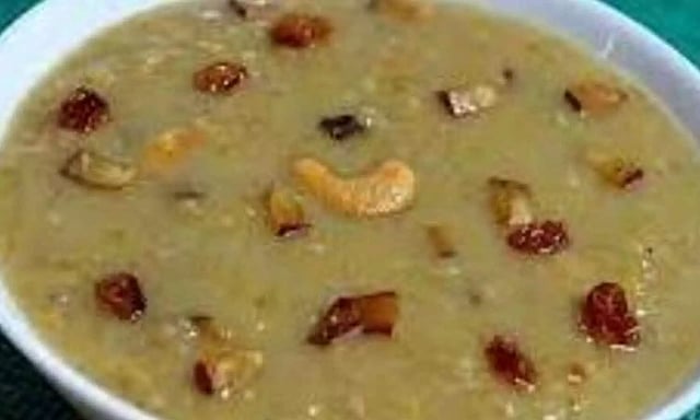 • அடுத்ததாக,நெய்யில் வறுத்த முந்திரி, திராட்சை ஆகியவற்றை சேர்க்கவும். அதோடு இரண்டு ஸ்பூன் நெய் சேர்த்து கிளறிவிட்டு, பின் கடைசியாக அதில் பால் சேருங்கள். பாலை நன்கு கலந்துவிட்ட பின், 5 நிமிடங்கள் மிதமான சூட்டில் வைத்து வேகவிட்டு இறக்குங்கள்.