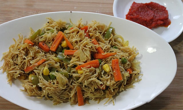 காய்கறிகள் வெந்ததும் கோதுமை சேமியா சேர்த்து அடுப்பை மிதமான தீயில் வைத்து கிளறி வெந்தவுடன் இறக்கவும்.