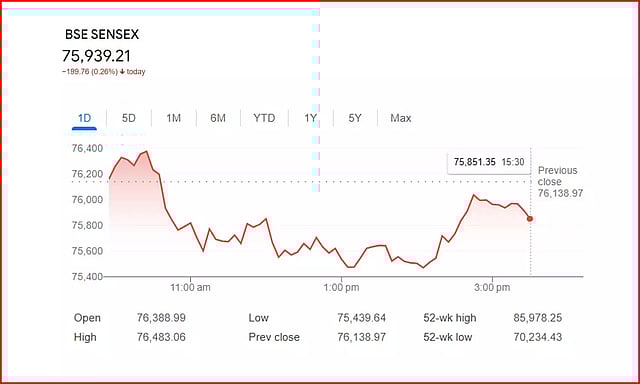 இன்றைய வர்த்தகத்தில் மும்பை பங்குச் சந்தை குறியீட்டு எண் சென்செக்ஸ் 199.76 புள்ளிகள் சரிந்து 75,939.21 புள்ளிகளில் நிறைவடைந்தது. இது 0.26 சதவீதம் சரிவு ஆகும். இன்று காலை வர்த்தகத்தின்போது 699.33 புள்ளிகள் குறைந்து 75,439.64 புள்ளிகளில் வர்த்தகமானது. அதன்பின் சுமார் 500 புள்ளிகள் உயர்ந்து 199.76 புள்ளிகள் சரிவில் வர்த்தகம் முடிவடைந்தது.
