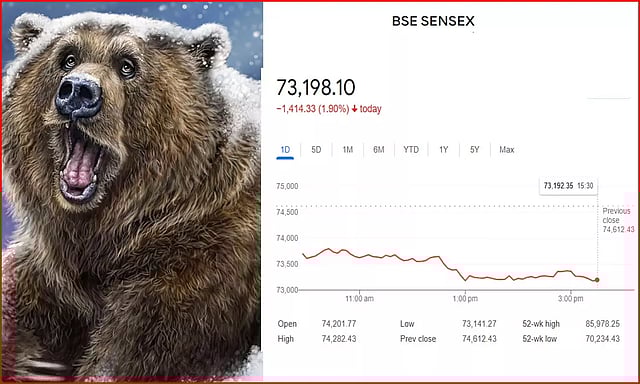 இறுதியாக வர்த்தகம் முடிவில் சென்செக்ஸ் 1414.33 புள்ளிகளில் சரிந்து மும்பை பங்குச் சந்தை 73198.10 புள்ளிகளில் நிறைவடைந்தது. சுமார் 1.90 சதவீதம் வீழ்ச்சியடைந்துள்ளது.