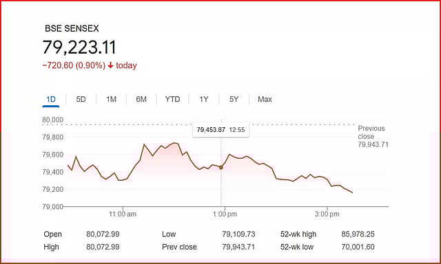 நேற்று வர்த்தகம் சென்செக்ஸ் 79,943.71 புள்ளிகளில் நிறைவடைந்த நிலையில் இன்று காலை சுமார் 130 புள்ளிகள் உயர்ந்து வர்த்தகம் 80,072.99 புள்ளிகள் தொடங்கியது. இன்று அதிகபட்சமாக சென்செக்ஸ் 80,072.99 புள்ளிகளிலும், குறைந்தபட்சமாக சென்செக்ஸ் 79,109.773 புள்ளிகளிலும் வர்த்தகமானது. இறுதியாக சென்செக்ஸ் 720.60 புள்ளிகள் வீழ்ச்சி கண்டு 79,223.11 புள்ளிகளில் வர்த்தகம் நிறைவடைந்தது.