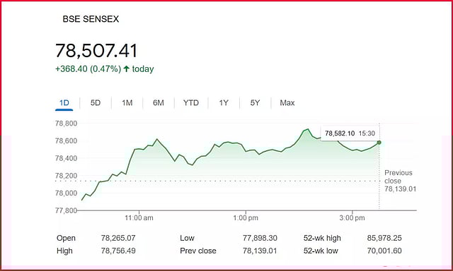 மும்பை பங்குச் சந்தை சென்செக்ஸ் 78,139.01 புள்ளிகளுடன் நேற்று நிறைவடைந்தது. இன்று காலை 9.15 மணிக்கு சுமார் சென்செக்ஸ் 126 புள்ளிகள் உயர்வுடன் மும்பை பங்குச் சந்தை சென்செக்ஸ் 78,265.07 புள்ளிகளுடன் வர்த்தகம் ஆரம்பமானது. அதன்பின் மெல்லமெல்ல உயர்ந்து கொண்டே சென்றது. காலை 11.20 மணியளவில் 78,610 புள்ளிகளை தொட்டது. அதன்பின் 12 மணியளவில் 78,320 புள்ளிகளுக்கு சரிந்தது. பின்னர் ஏற்றம் கண்டு முடிவில் 368.40 புள்ளிகள் உயர்ந்து சென்செக்ஸ் 78,507.41 புள்ளிகளில் வர்த்தகம் நிறைவடைந்தது.