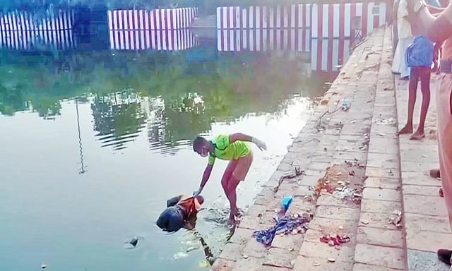 பக்தர்கள் குளத்தில் இறங்கி குளிக்க வேண்டாம் என கோயில் நிர்வாகம் சார்பில் அறிவிப்பு எச்சரிக்கை பலகை அங்கு வைக்கப்பட்டுள்ளது.