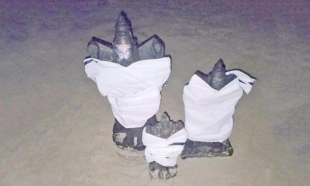 தீவு கிராம கடற்கரையோர பகுதியில் பழமை வாய்ந்த மூன்று கற்சிலைகள் மீட்கப்பட்ட சம்பவம் அப்பகுதியில் பரபரப்பை ஏற்படுத்தியுள்ளது. சிலைகள் எப்படி தீவு கிராம பகுதிக்கு வந்தது என்பது குறித்து புதுப்பட்டினம் காவல்துறையினர் விசாரணை மேற்கொண்டுள்ளனர்