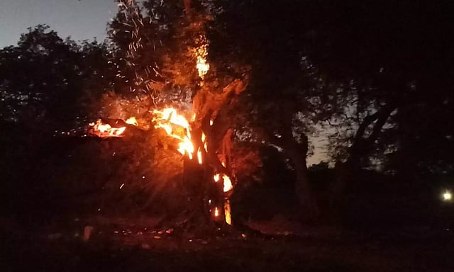 விழுப்புரம் மாவட்டம், மயிலத்தில் தனியார் கல்லூரிக்கு சொந்தமான விளையாட்டு மைதானம் ஒன்று உள்ளது. இங்கு பழமையான மரங்கள் அதிகம் உள்ளன. இதில் நேற்று இரவு சுமார் 500 வருடம் பழமையான புளிய மரம் ஒன்று திடீரென தீ பற்றி எரிந்தது.