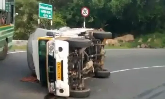 இந்நிலையில் இன்று காலை கர்நாடக மாநிலத்தில் இருந்து கேரளா மாநிலத்திற்கு காய்கறி லோடுகளை ஏற்றி சென்று கொண்டிருந்த சரக்கு வேன் ஒன்று திம்பம் மலைப்பகுதியில் உள்ள 7-வது கொண்டை ஊசி வளைவில் திரும்பும்போது எதிர்பாராத விதமாக டிரைவரின் கட்டுப்பாட்டை இழந்து சாலையில் கவிழ்ந்து விழுந்தது.