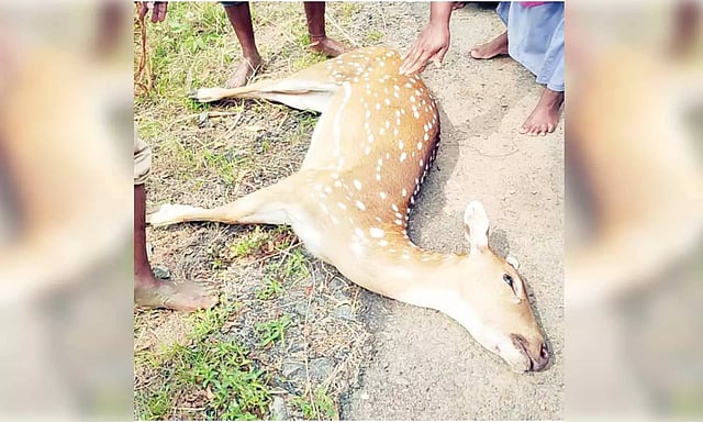 இந்த புள்ளிமான் நாய் துரத்தியதில் முள்வேலியில் மோதிய அதிர்ச்சியில் இறந்ததா, அல்லது வேறு காரணமா என தெரியவில்லை.