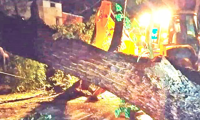 மேட்டுப்பாளையம் மற்றும் அதன் சுற்றுவட்டார ப்பகுதிகளான காரமடை, சிறுமுகை உள்ளிட்ட பல்வேறு பகுதிகளில் நேற்று மாலை முதலே தொடர் கனமழை பெய்து வருகிறது. இந்த நிலையில் மேட்டுப்பாளையம் - சிறுமுகை சாலையில் மோத்தேபாளையம் பஸ்நிறுத்தம் அருகே சாலையோரம் இருந்த சுமார் 80 அடி உயரமுள்ள ராட்சத மரம் சாய்ந்தது. அப்போது அருகில் இருந்த மற்றொரு மரமும் சேர்ந்து சாய்ந்தது.