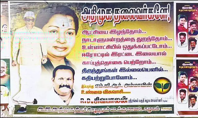 ஈரோட்டில் இரட்டை இலையால் காப்புத்தொகை பெற்றோம். திருந்துங்கள் இல்லையெனில் கதியற்றுப் போவோம். இப்படிக்கு எம்.ஜி.ஆர்., அம்மாவின் உண்மை விசுவாசி... ஆர்.டி. சிவபாலன், ஸ்ரீரங்கம் பகுதி செயலாளர் (கிழக்கு) என அச்சிடப்பட்டுள்ளது. இந்த சுவரொட்டி கட்சி நிர்வாகிகளிடம் பரபரப்பை ஏற்படுத்தி உள்ளது.